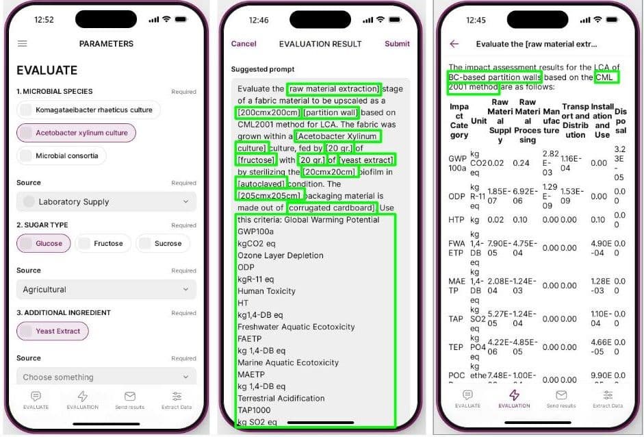 We conducted a Life Cycle Assessment (LCA) using the CML 2001 method (ISO 14040:2006), covering impact areas like global warming potential, resource depletion, acidification, and eutrophication. Notably, current LCA tools overlook biofabrication-specific phases like microbial fermentation and sterilization. To address this, we developed an AI-assisted LCA mobile app (Figure 15) to include these novel processes and enhance precision in evaluating environmental impact.