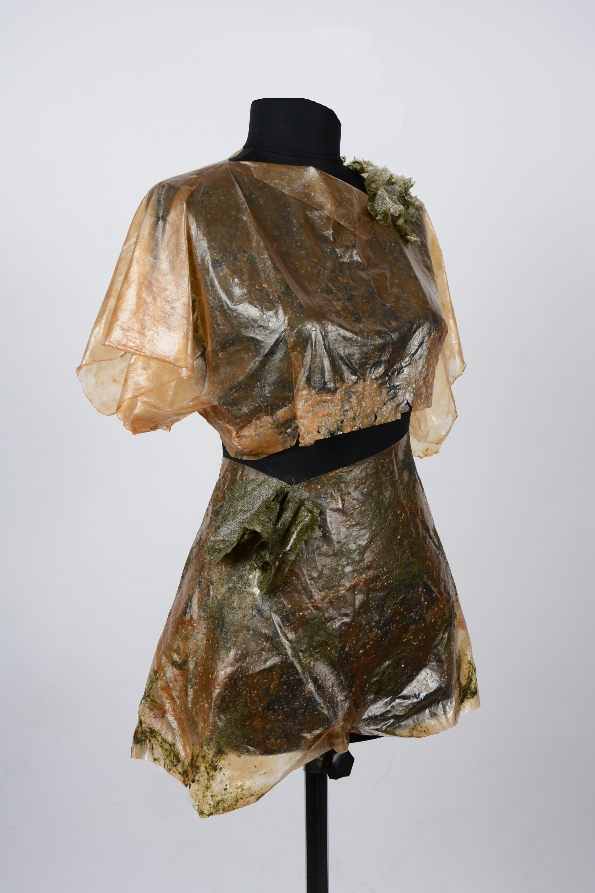 Bacterial cellulose has an unusual combination of properties for a naturally produced material. At the microstructural level, it forms a dense network of nanofibers held together by hydrogen bonds, resulting in a high tensile strength-to-weight ratio, far surpassing plant-based cellulose sheets of similar thickness. In thin sections, it remains flexible enough to form double-curved shapes without cracking. However, when layered or reinforced, it transforms into a much stiffer, more load-capable material. Its tunability allows for applications such as interior partitions, acoustic panels, suspended ceiling modules, or flexible formwork. Moreover, its surface texture enables strong bonding with coatings, resins, or secondary materials, which expands design potential. Aesthetically, its ageing properties (e.g. color and texture shifts over time) were initially explored through the fashion collection "Harvesting Biofabrics", exhibited at Good Design_7 Izmir, 2022.