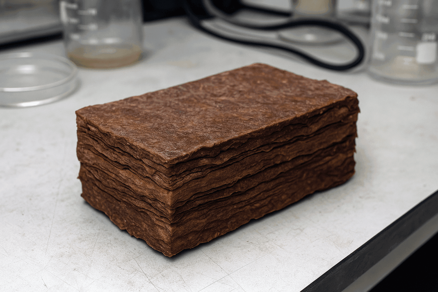 One major challenge was maintaining uniform sheet thickness, since inconsistencies lead to warping during drying. We optimized this by improving nutrient flow, stabilizing pH and temperature, and introducing gentle agitation. Another issue was microbial contamination, addressed via sanitation protocols and filtered nutrient inputs. Drying posed a further challenge: large sheets distorted unless tensioned drying frames and adjusted pressing cycles were used. We are currently developing AI-assisted environmental monitoring to catch issues early.