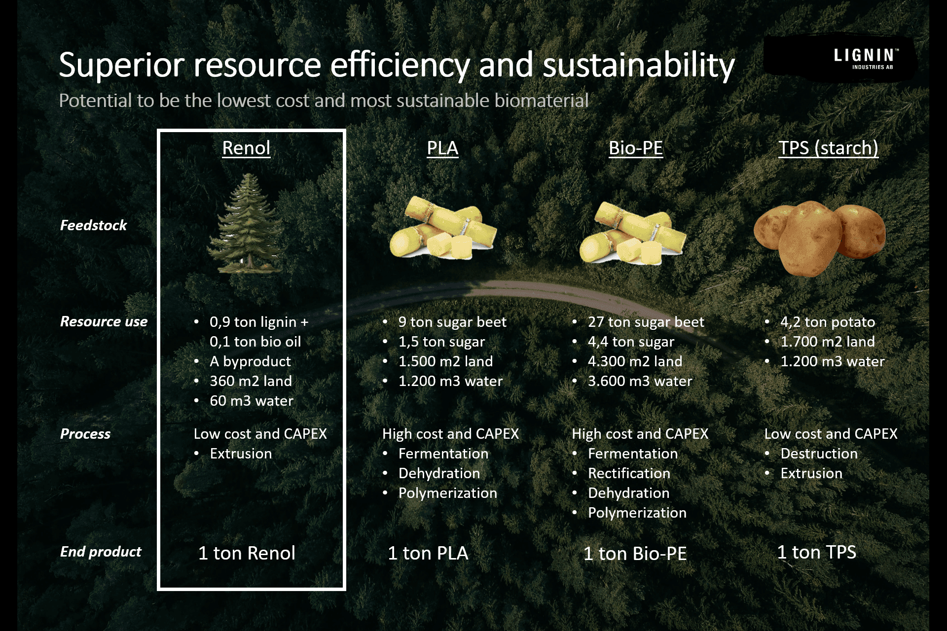 The Lignin is there. We don’t need to harvest more. We just have to make sure it is not burnt for a very low energy value and instead used as a higher-value input into bio-plastics. There will be no need to use land for farming materials that are supposed to provide us with more lignin. The over 100 mio tons available annually are enough. We are truly resource-efficient in the way we develop our Renol.