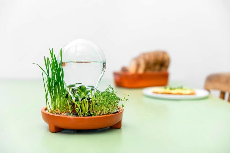 The Patella Crescenda is made from glazed terracotta, recycled glass, and stainless steel, materials we chose deliberately for both function and longevity. The terracotta base provides a stable, natural reservoir, while the stainless steel growth disks are easy to clean, don’t retain moisture, and resist bacterial growth. The absence of soil removes one of the main causes of mold in home-growing setups. These durable materials not only promote hygienic growth, but are also fully recyclable and designed to last for years, in line with our design principles.