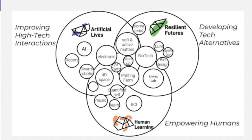 - Research pillars: Human Learning, Artificial Life, and Resilient Future—with the latter advancing DIY bioreactors, biosensors and “programmable degradation” so interfaces decompose after use.