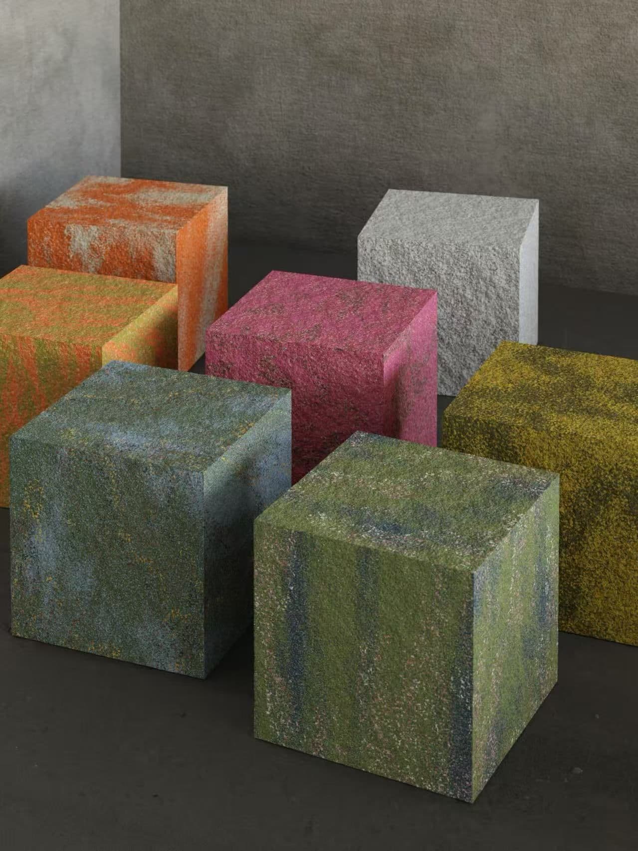 Our material’s structural integrity is a result of controlled layering and compression techniques rather than chemical additives. While we embrace the natural elasticity of rubber, we stabilize the material through a combination of thermoforming and precision molding during regeneration. This approach allows us to retain the material’s playful, tactile quality while ensuring it's suitable for low-impact decorative applications such as wall panels and furniture surfaces.