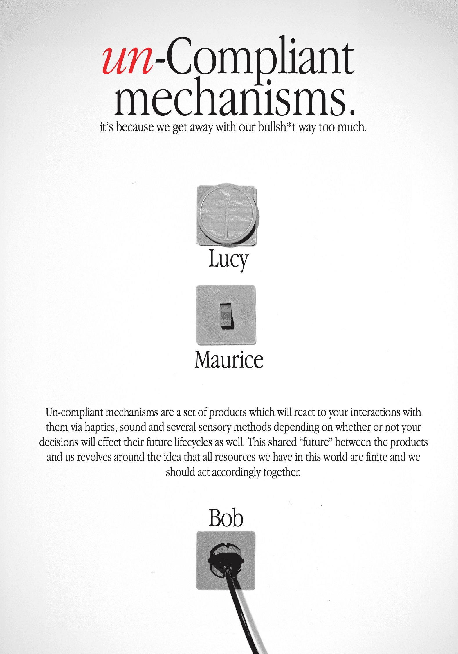 Un-compliant Mechanisms is an exploration of a world where humans are not the sole rulers of their surroundings, but rather co-habitants with objects, commodities, and the environment as a whole.