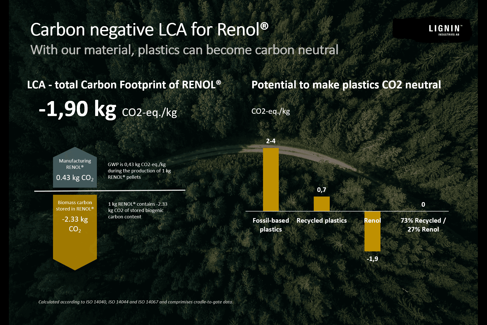 Our Renol has an LCA of -1,9 kg CO2 equiv./kg — verified through third-party analysis based on ISO standards. It provides similar performance as normal plastics if used as drop-in material at levels <25-30%. We have produced PE films with solid properties, ABS with solid impact strength, and PP as well.