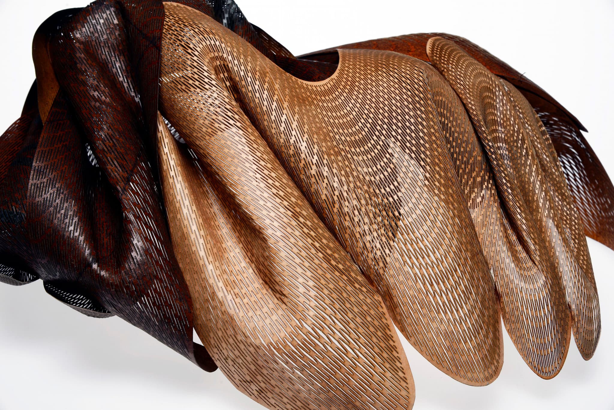 Combining traditional Japanese techniques with modern technology has become a natural progression in my practice. Drawing inspiration from Kakishibu dyeing (fermented persimmon tannin) and Katagami stencils (Washi paper coated with Kakishibu), I focus on revealing the organic strength and beauty of paper. In contrast, laser cutting allows me to explore new levels of precision and intricacy. Rather than opposing each other, these approaches complement and complete one another. Traditional methods bring depth, tactility, and durability, while digital tools offer expanded design possibilities and scalability.